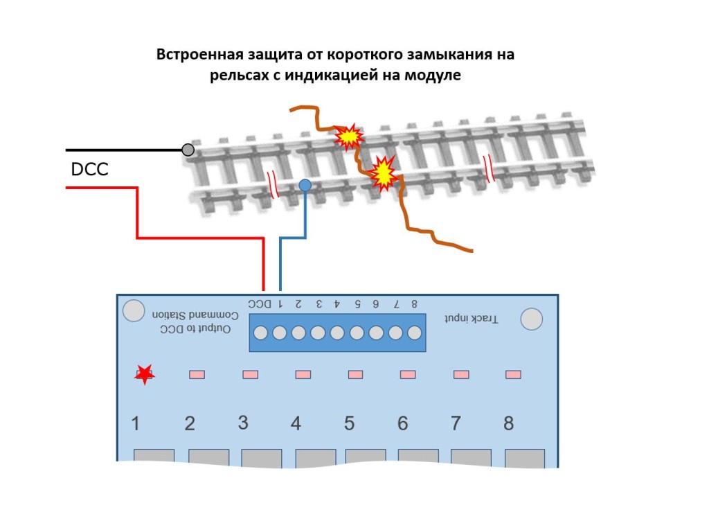 - Встроенные токовые датчики (детекторы занятости участков) со светодиодной индикацией состояния каждого входа.