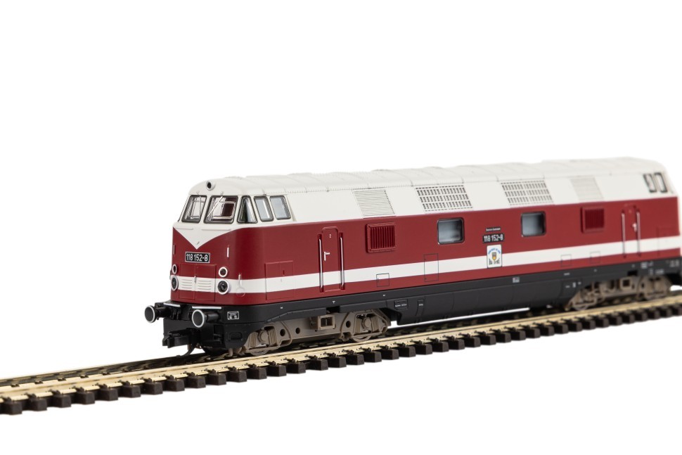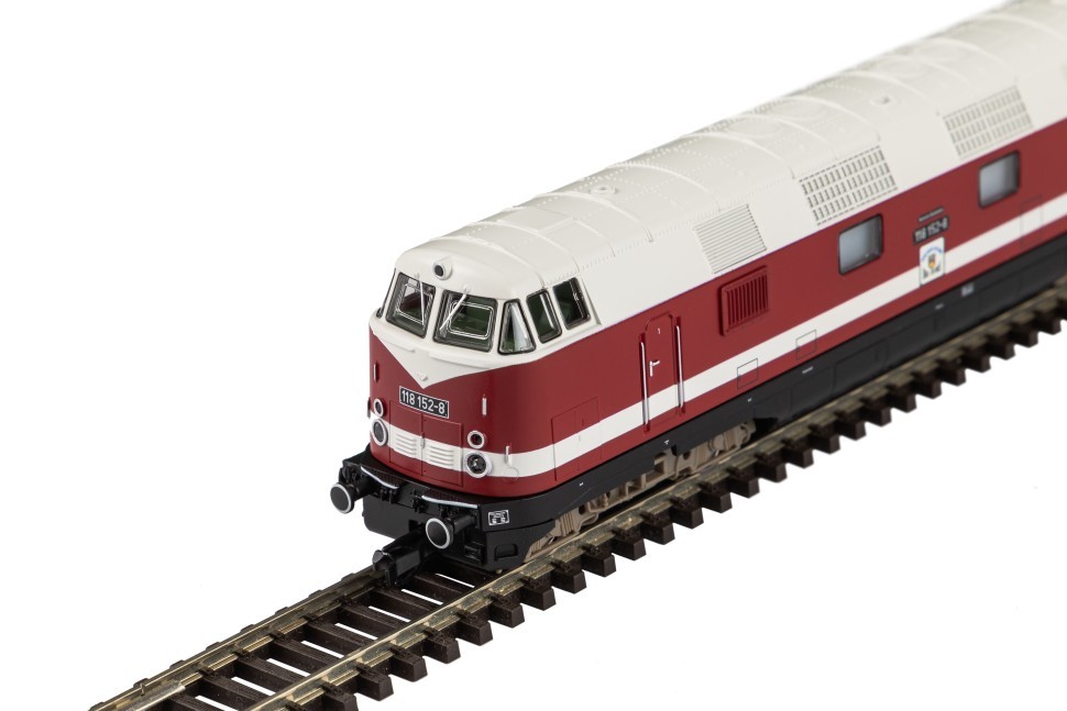 Четырехосный тепловоз BR 118 с символикой FDJ (Союз свободной немецкой молодёжи) принадлежности ГТД, эпохи IV. Тепловоз изготовлен в аналоговой версии. Буферные огни переключаются с белого на красные в зависимости от направления движения. Плата локомотива имеет интерфейс PluX16, что обеспечивает возможность несложной установки цифрового декодера арт. 56502 или звукового декодером с динамиком арт. 46552.