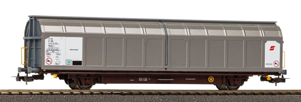 Вагон с раздвижными стенками Hbbillns, принадлежности ÖBB. Модель вагона имеет типовую цветовую гамму и шрифты, характерные для Эпохи V.